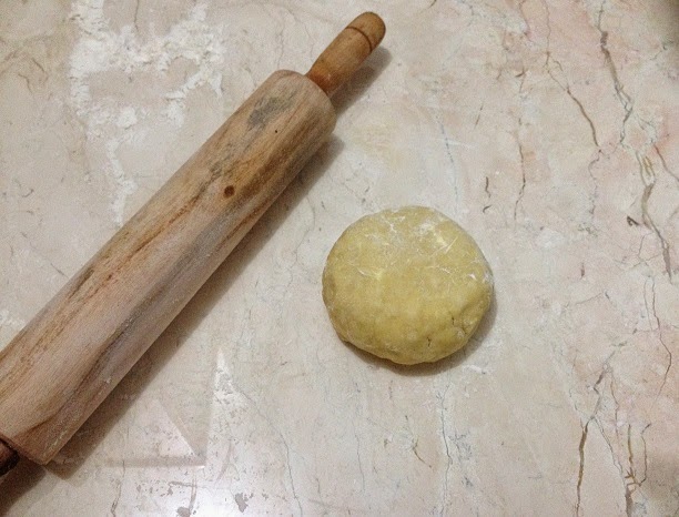 5. Keluarkan adonan pie dari kulkas. Taburin sedikit tepung di alas pengilingan, rolling pin & di atas adonan. Pipihkan sedikit dengan tangan.